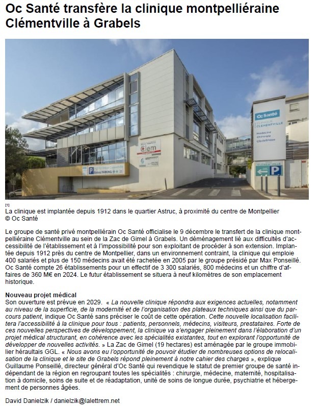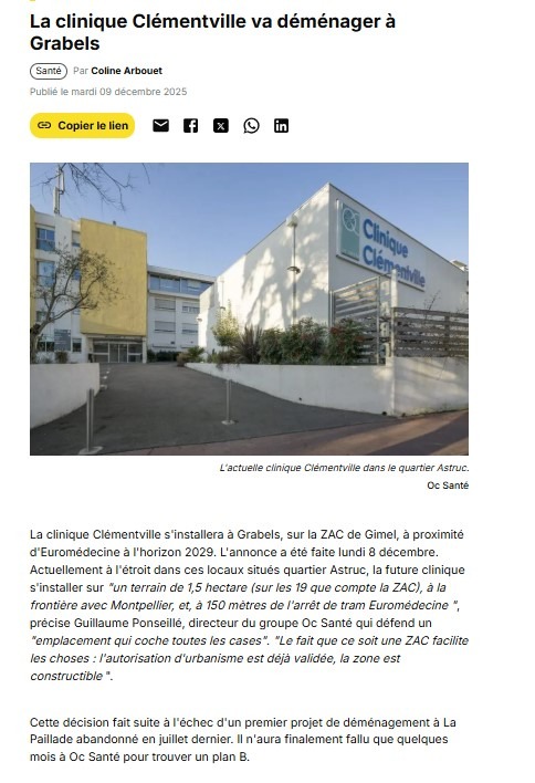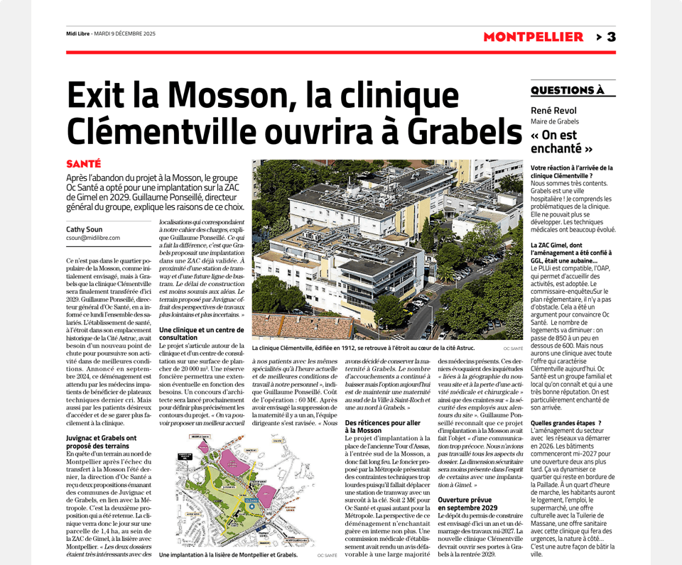 Le groupe Oc Santé a choisi le site de la ZAC de Gimel, situé à 9 kilomètres de l’implantation actuelle de la clinique Clémentville, grâce à une collaboration active avec la Mairie de Grabels, Montpellier Méditerranée Métropole et le groupe GGL, aménageur de la ZAC.